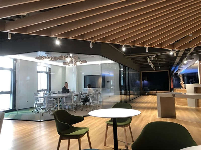 材料運用上,采用一系列天然、可再生和低排放的節(jié)能措施和材料,讓員工感受到與自然的聯(lián)系,同時提供了室內(nèi)聲學(xué)舒適度。還采用了公司貿(mào)易產(chǎn)品——玻璃,各種玻璃的運用,充分體現(xiàn)了企業(yè)性質(zhì)及對玻璃加工工藝的理解,既作為裝飾材料,也讓辦公區(qū)各個區(qū)域都成了產(chǎn)品展示區(qū),電梯廳和門廳運用了黑色背烤漆蒙砂玻璃,電梯廳頂部運用黑色銀鏡腐蝕雕刻形成總部辦公地所在的區(qū)域地圖,其他區(qū)域也充分將壓花玻璃、幕墻玻璃、淋浴隔斷玻璃及辦公高隔玻璃等進(jìn)行了充分展示。