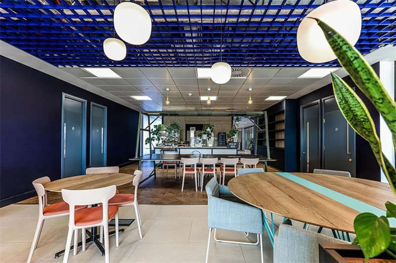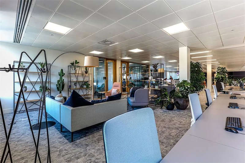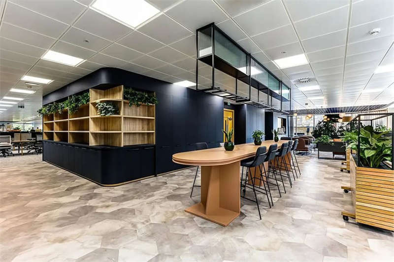 此番改造的一個重要主因是給到員工愿意回歸辦公室的理由。這意味著提升整體設(shè)施的實用性和美觀性,同時增加協(xié)作空間并整合遠(yuǎn)程工作人員的需求。因此對當(dāng)代前沿科技的投資成為關(guān)鍵要素。為了支持混合工作模式,設(shè)計公司在早期就任命了一名AV專家,以便可以通過應(yīng)用程序或基于桌面的預(yù)訂系統(tǒng)預(yù)訂工作空間。同時,傳統(tǒng)工作站與可替代工作設(shè)施之間的界限也進(jìn)一步擴大,平均(NIA室內(nèi)凈面積)比率為1:10。此外,之前辦公桌與員工1:1的比例也被新的1:1.6比例所取代。