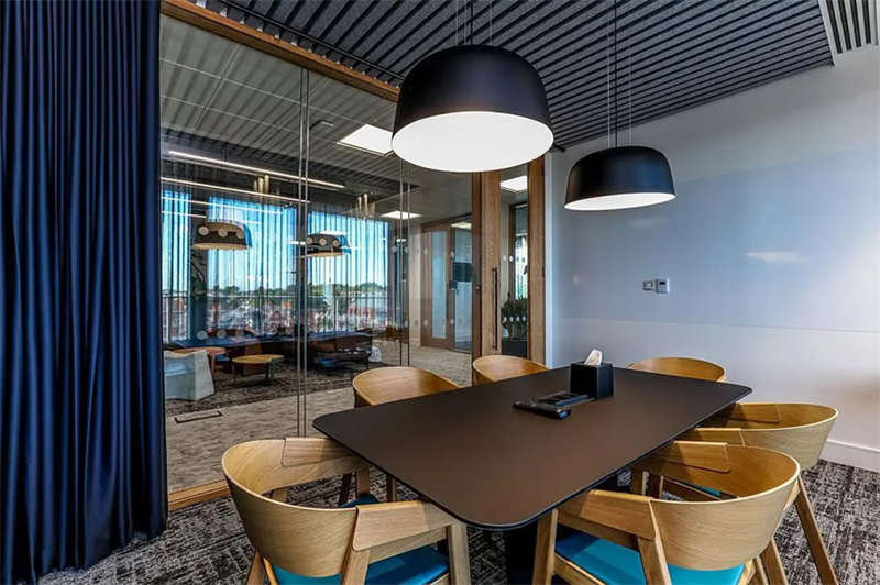 照明方案采用了多種光照的組合形式,以創(chuàng)建自然日光的感覺。對于技術(shù)部門來說,重要的是照明不能太高科技感或像一個大燈箱,因此這里使用了軌道照明代替漫射器和聚光燈。會議室以吊燈為主,突出與會人員的面部照明,以及屏幕上方用于遠(yuǎn)程通話的燈光,因此,需要更專業(yè)的照明設(shè)計,以清晰、明亮的映襯和傳遞人物形象。