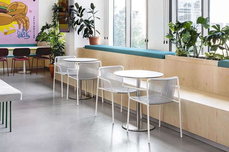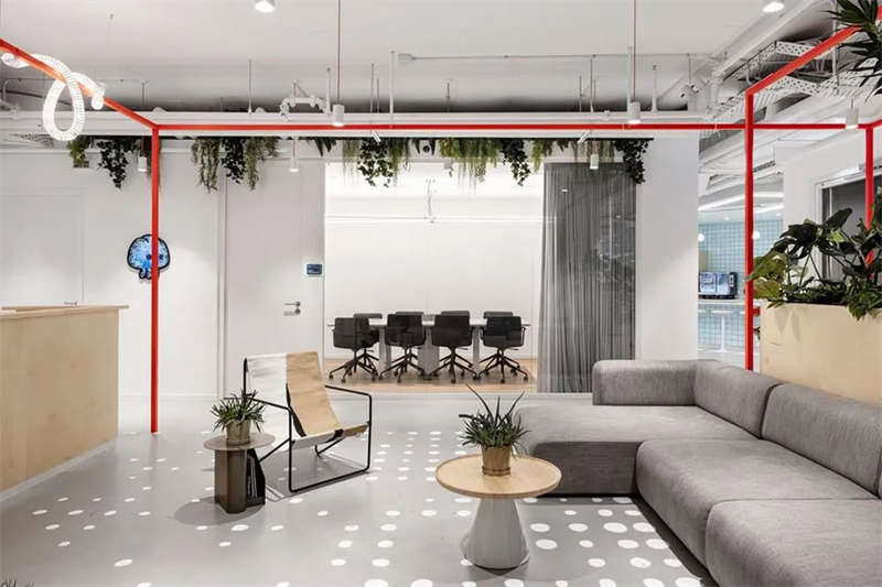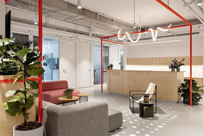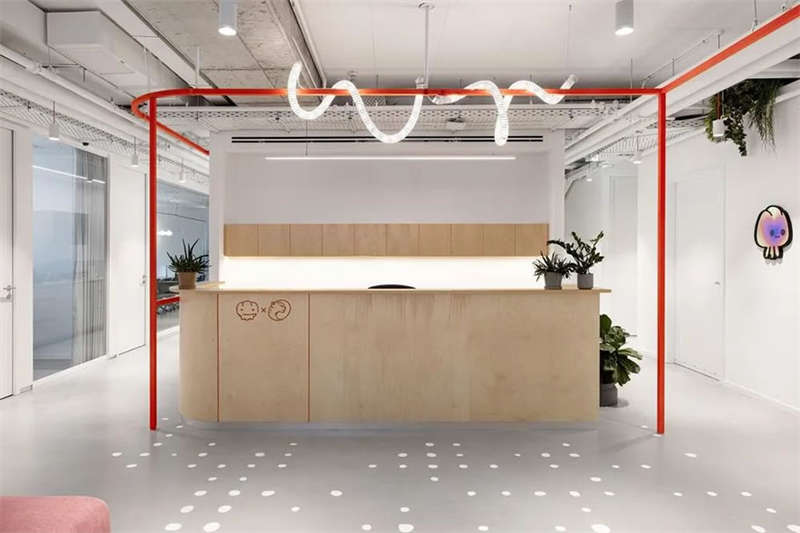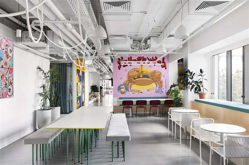 本案的設計出發(fā)點旨在創(chuàng)建一個獨特的空間體驗。在以混凝土、裸露的白色天花樓板、綠色植物、天然木材和白色金屬構筑的中性調空間背景中,注入跳躍的色彩和卡通圖形設計去展現(xiàn)其設計理念。