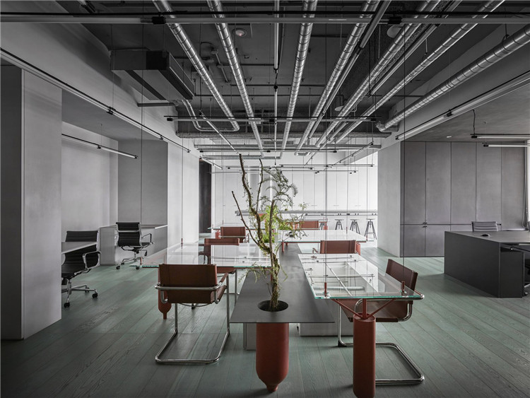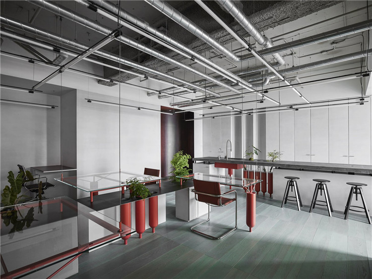 當(dāng)靈感關(guān)鍵抓緊"科學(xué)"而非"辦公室",設(shè)計師希望強(qiáng)化產(chǎn)業(yè)屬性里的科學(xué)基底,扭轉(zhuǎn)一般人對辦公室的刻板藍(lán)圖.回歸產(chǎn)品本身最貼近的實(shí)驗(yàn)室、工廠環(huán)境,日日可見的試管、生鐵黑鐵、氣體輸送管,以及包裝承載科技?xì)怏w的獨(dú)特鋼瓶,擷取生產(chǎn)鏈上再熟悉不過的材質(zhì)與造型,拆解轉(zhuǎn)換成辦公空間的結(jié)構(gòu)形體.