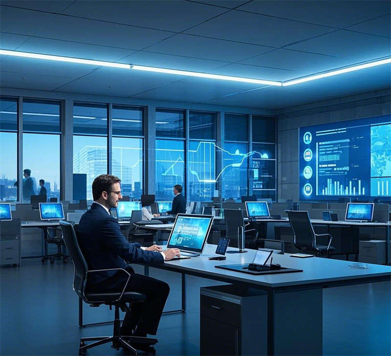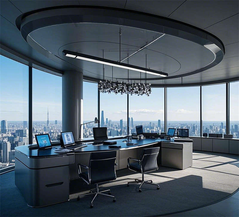 前臺接待室以懸浮式前臺和全息投影動(dòng)態(tài)logo為核心,金屬質(zhì)感墻面與燈光效果結(jié)合,營造出未來之門的第一印象。敞開式辦公室通過數(shù)據(jù)流全息屏幕和智能辦公桌,打造高效協(xié)作的數(shù)字化辦公環(huán)境。經(jīng)理辦公室采用全景落地窗和智能辦公系統(tǒng),簡約大氣,兼顧商務(wù)與舒適。總裁辦公室位于頂層,全景視野與奢華材質(zhì)相得益彰,藝術(shù)裝置彰顯領(lǐng)導(dǎo)風(fēng)范。