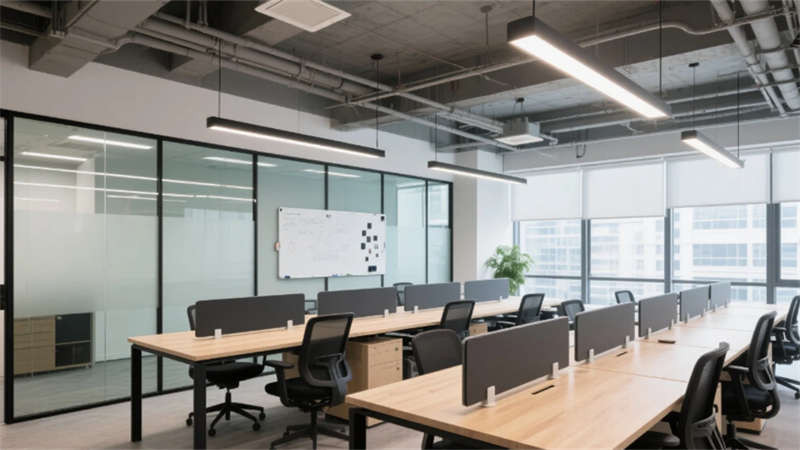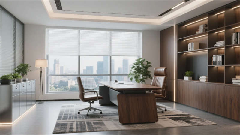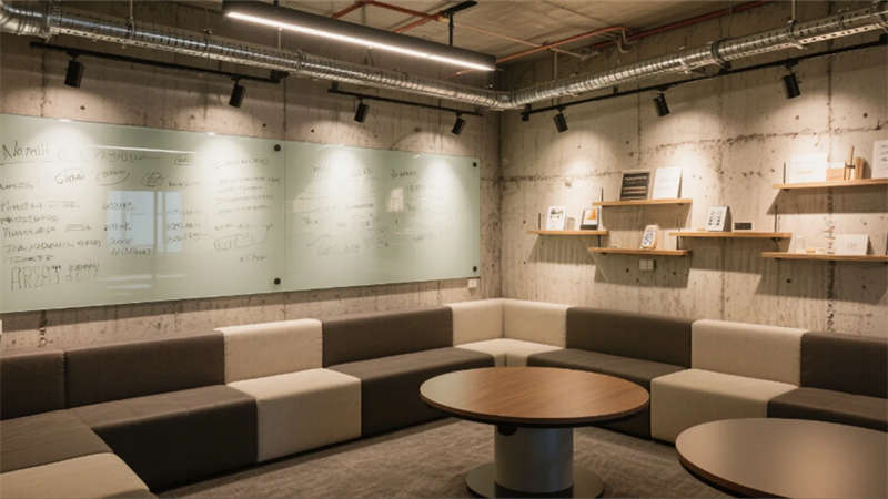 從前臺懸浮木紋臺面的企業(yè)標(biāo)識,到開放式工位可變的模塊化組合,空間始終保持著“未完成”的進(jìn)化基因。頭腦風(fēng)暴區(qū)的可書寫玻璃墻記錄著思維軌跡,階梯培訓(xùn)區(qū)的滑軌電源系統(tǒng)隨需求生長,智能會議室霧化玻璃在透明與私密間自由切換,專注電話艙的磨砂質(zhì)感包裹著獨(dú)立思考的靜謐。高管辦公室的皮質(zhì)座椅與垂直線條燈帶,隱喻著決策的柔韌與果決,而咖啡區(qū)黑板墻的手繪痕跡,則讓機(jī)械齒輪般的空間有了呼吸的節(jié)奏。