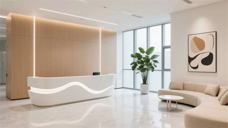 本設計以現(xiàn)代簡約為核心理念,通過光與自然的交融重塑辦公體驗??臻g以純凈的白色與溫潤木色為主調(diào),輔以低飽和度灰綠點綴,營造通透靜謐的氛圍。落地窗最大化引入自然光線,與線性燈帶共同勾勒出流暢的視覺韻律;綠植貫穿每個角落,從大堂的琴葉榕到辦公區(qū)的垂直花園,賦予空間呼吸感。