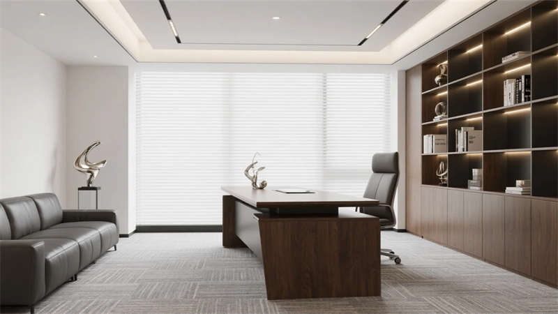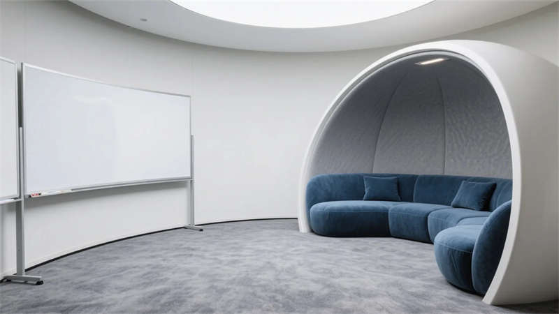 核心區(qū)域聚焦功能與美學(xué)的平衡:前臺(tái)木格柵墻以線性燈光延展空間縱深感;開放式工位區(qū)通過綠植與幾何畫作注入生機(jī);獨(dú)立辦公室運(yùn)用胡桃木與皮質(zhì)元素提升質(zhì)感,整墻書架成為智慧沉淀的象征。過渡空間被賦予多重價(jià)值——走廊生態(tài)墻引入自然呼吸,蛋形討論艙激發(fā)即興靈感,階梯圖書館則營(yíng)造沉思角落。
