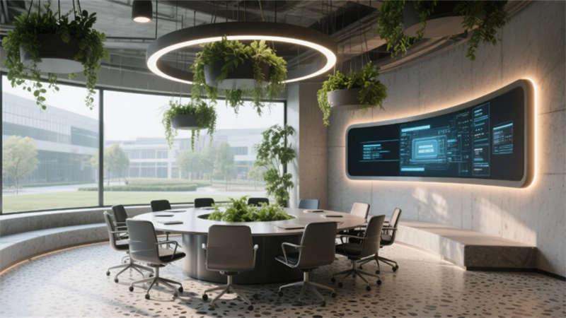 該辦公空間以"自然共生"為核心理念,將科技感與人文溫度融入兩千平米的開(kāi)放場(chǎng)域。流動(dòng)的淺木色調(diào)貫穿始終,啞光金屬與微水泥形成質(zhì)感對(duì)話,模塊化家具構(gòu)建靈活場(chǎng)景。綠植生態(tài)系統(tǒng)從空中吊籃蔓延至苔蘚墻面,模糊室內(nèi)外界限。