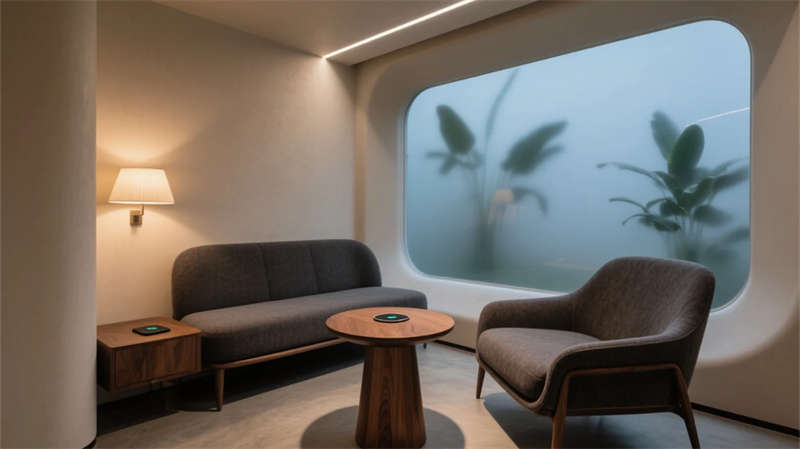 智能會(huì)議艙化身科技繭房,霧化玻璃平衡開(kāi)放與隱私,觸控桌面簡(jiǎn)化流程。貫穿始終的暖木、灰白與苔蘚綠,在全景天光下沉淀出寧?kù)o能量。此處不僅是工作容器,更是蚌埠創(chuàng)新浪潮下,滋養(yǎng)靈感、尊重個(gè)體的未來(lái)生態(tài)聚落。