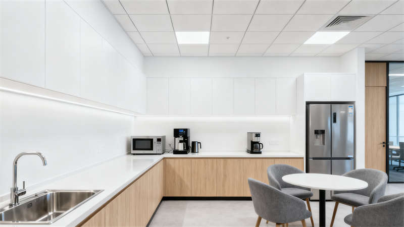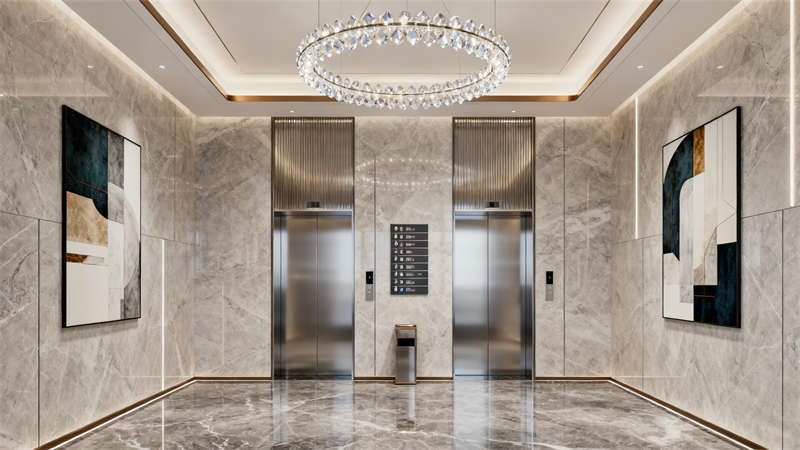 茶水間兼顧實用與休閑屬性,齊全的設備滿足日常需求,休閑桌椅的設置為員工提供放松空間。電梯廳延續(xù)整體簡約風格,大理石材質(zhì)與裝飾畫、水晶吊燈的搭配,提升空間精致感,指示牌的清晰設置保障通行便捷。