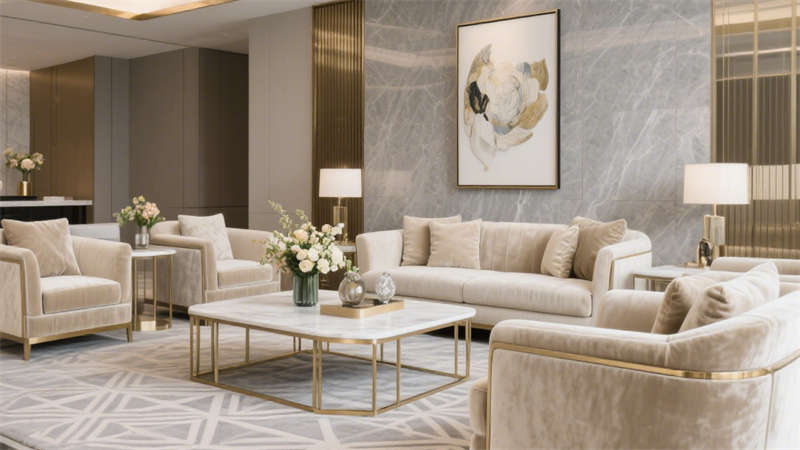 本設計以輕奢風格為核心,通過柔和的基底色調與精致的細節(jié)搭配,構建出兼具質感與舒適度的酒店環(huán)境??臻g以米白色與淺灰色為基礎,巧妙融入金色金屬線條作為點綴,既避免了過度奢華的厚重感,又增添了空間的精致度。墻面與地面選用細膩的大理石紋理材質,在光線映襯下呈現(xiàn)出自然的光澤,提升整體空間的高級感。家具選型注重線條的簡約流暢,搭配柔軟的布藝軟裝,營造出溫馨舒適的居住氛圍。各個區(qū)域在設計上保持風格統(tǒng)一,從公共空間到客房區(qū)域,都延續(xù)了輕奢的設計語言,讓整體空間既富有格調,又能給人帶來放松愜意的居住體驗。