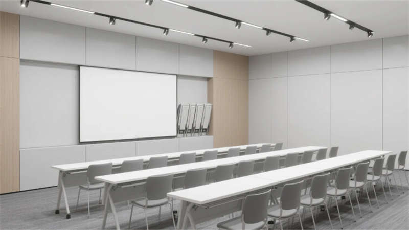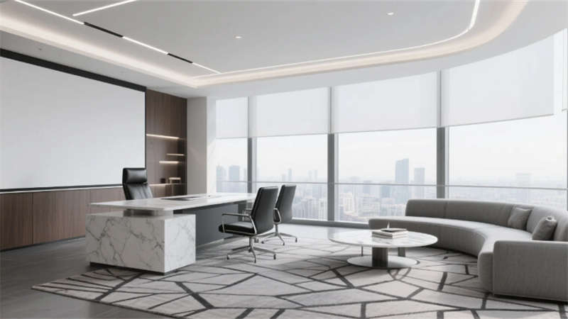 高管辦公空間彰顯差異化設(shè)計(jì):經(jīng)理辦公室以木格柵墻面與模塊沙發(fā)營(yíng)造親和力,總裁辦公室則通過(guò)深胡桃木隱形門(mén)、弧形沙發(fā)與城市景觀落地窗凸顯沉穩(wěn)氣度。多功能廳采用可伸縮隔斷與嵌入式LED屏,適應(yīng)培訓(xùn)、會(huì)議等多場(chǎng)景需求;茶水間以中島吧臺(tái)與幾何層板打造輕松社交空間,筒燈聚焦的綠植墻增添生機(jī)。