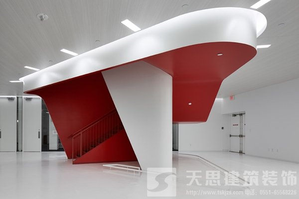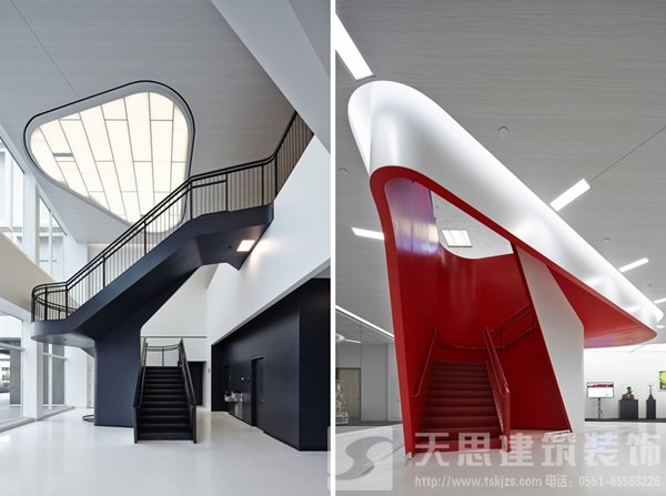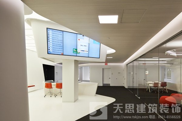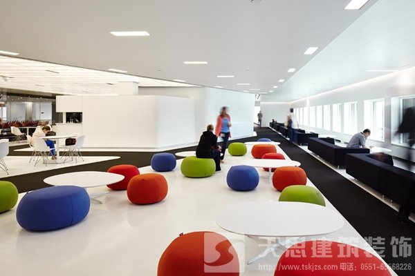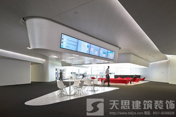 綜合大樓過(guò)渡區(qū)設(shè)計(jì)為開放式合作工作區(qū)域,傳統(tǒng)的理念通常認(rèn)為這里和工作場(chǎng)所相比不是那么有用,但是很多富有成效的非正式的討論往往在這里誕生。每個(gè)工作中心都配有色彩鮮明的家具,頂部下方挑檐底面突出的吊頂造型內(nèi)嵌LED顯示屏,不斷滾動(dòng)播出最新信息,包括各種通知、員工和訪客新聞、各種公告、新聞事件以及全球3M公司員工信息。