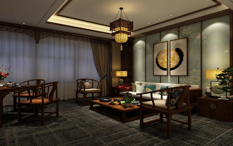 設(shè)計師在裝修設(shè)計充分考慮了中式元素的性質(zhì)和特點,使其既滿足其功能和經(jīng)營特點需求,又兼顧現(xiàn)代技術(shù)要求及中式風(fēng)格.因此在空間的功能、色彩、光影、材料、配飾、綠化等方面都在變化中尋求完美的統(tǒng)一,讓合理的空間格局給人們以美的感受.