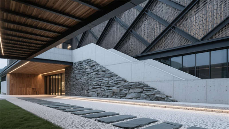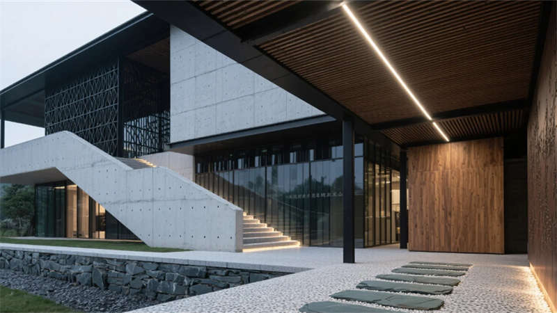 建筑外觀以滁州竹海為靈感,斜交網(wǎng)格結(jié)構(gòu)勾勒出山勢輪廓,穿孔鋁板在光影間呼吸。懸浮橡木雨棚如云中棧橋,將自然意象引入現(xiàn)代語境。青石板基座延伸至室內(nèi),形成連貫的在地?cái)⑹隆?/p>