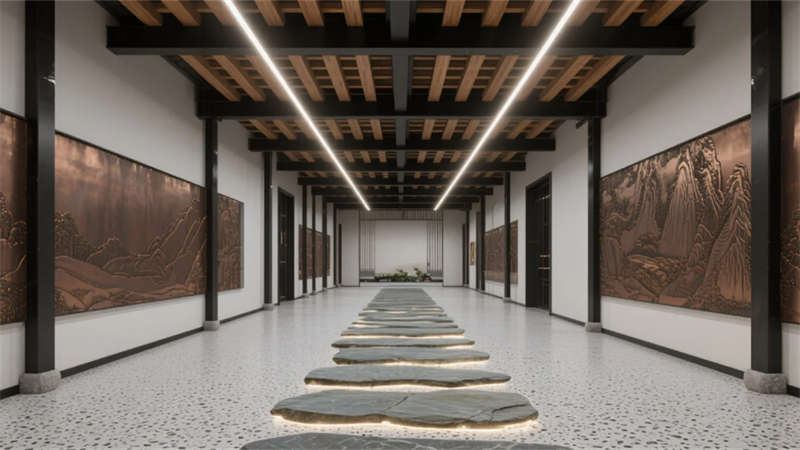 前臺大廳成為文化凝練的序章:層疊銅藝山形墻在光暈中起伏,夯土臺面與懸浮木構(gòu)的碰撞隱喻傳統(tǒng)與未來的對話。紙膜藝術(shù)燈如空中浮云,柔化工業(yè)風(fēng)的冷峻基調(diào)。