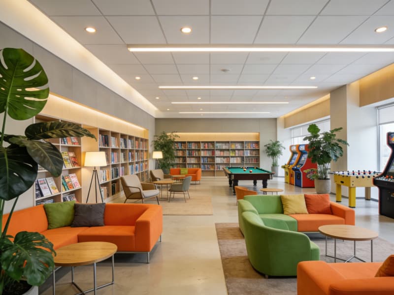 員工休息區(qū)充滿活力與溫馨,彩色的沙發(fā)錯落擺放,搭配綠植與休閑桌椅,為員工打造一個(gè)放松身心的舒適角落。還設(shè)置了小型的閱讀區(qū)與娛樂設(shè)施,豐富員工的業(yè)余生活。