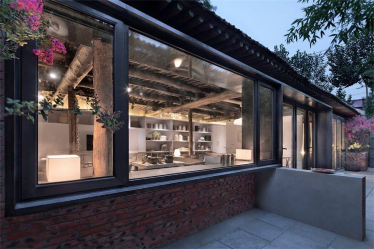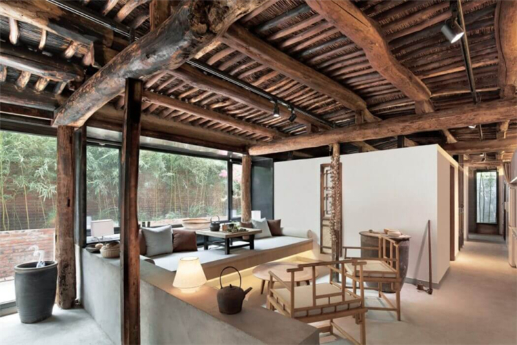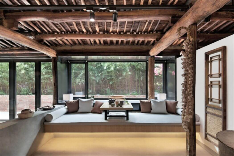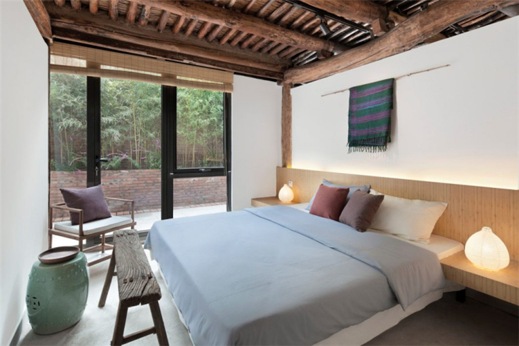 而我們在這次的民宿的功能布局方面,我們根據與居民的詳細溝通,了解他們的日常生活和習慣,進行調整,重新組織平面圖。在我們拆除吊頂后,更多的空間被釋放,原始的木結構和稻草覆蓋的天花板紋理終于顯露出來,講述了一個時間的故事。在現場勘察過程中,我們在建筑物西側和鄰近墻壁之間發(fā)現了一條約80厘米寬的狹窄通道。因此,我們在走廊盡頭向西側設計了一個觀景窗。在窗外,擺動的竹影有助于將室內空間與自然環(huán)境相連。