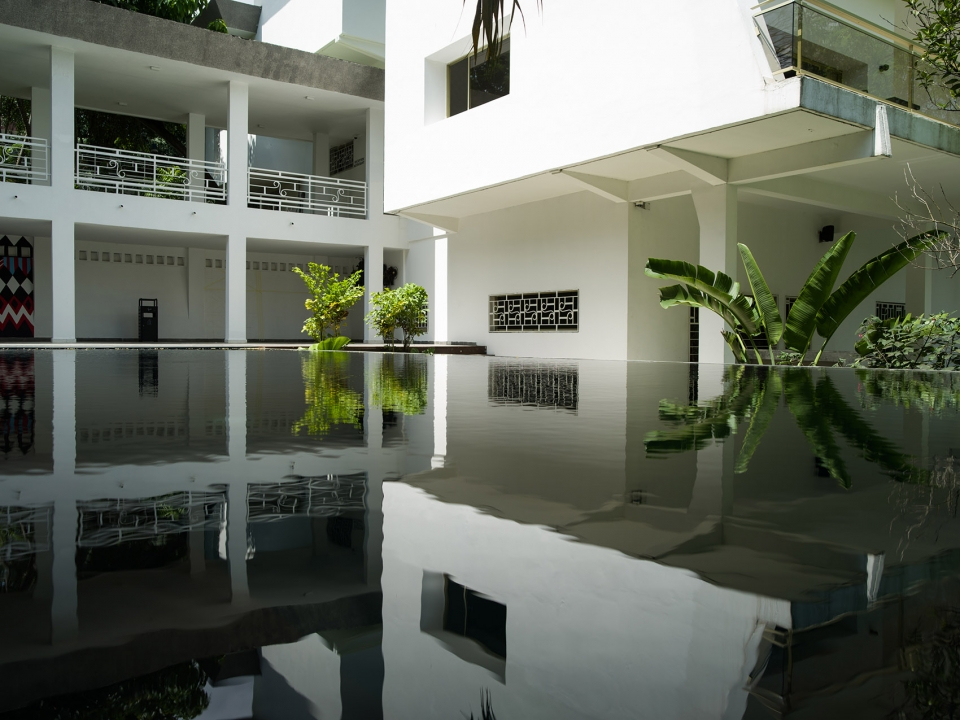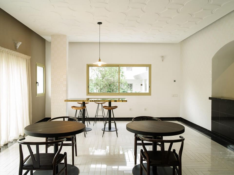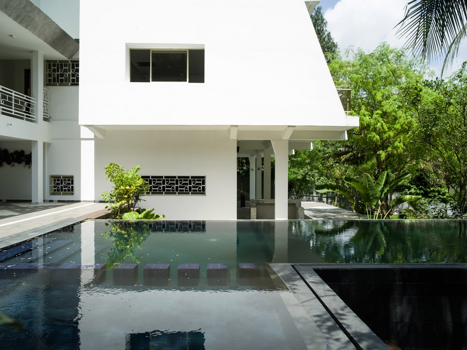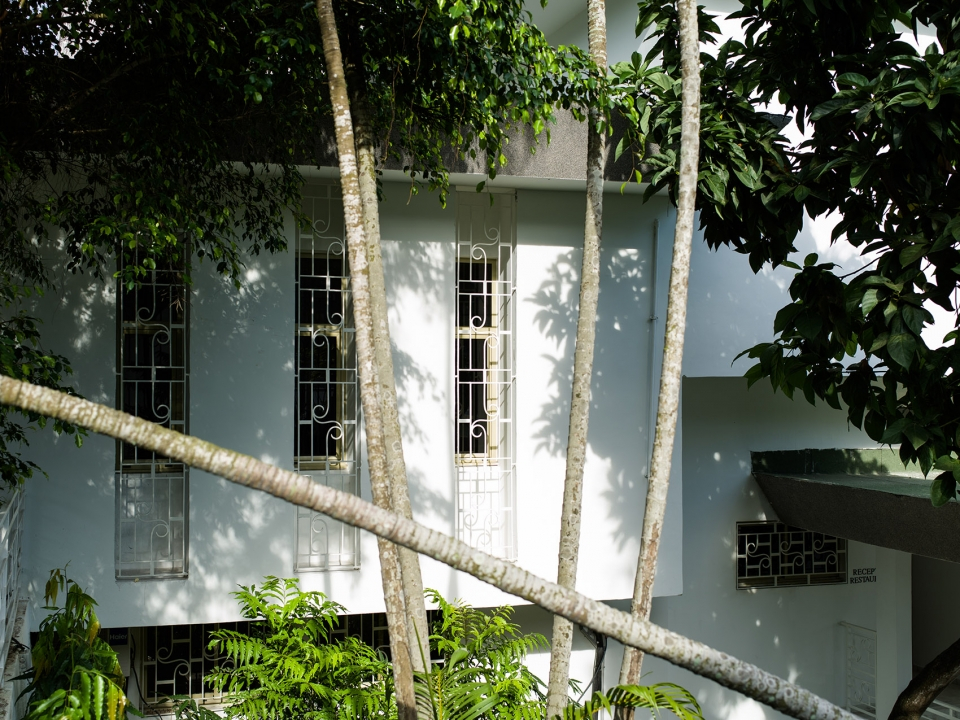 酒店外觀局部,建筑在泳池中投下倒影,部分外部視圖,池反射建筑物。健身房和養(yǎng)生區(qū)位于原建筑的廚房處,擁有良好的自然通風(fēng)以及朝向。游泳池又長又窄,客人們可以在其中進行來回往復(fù)式的游泳運動,同時還在炎炎夏日里為客人們提供了一個消暑空間,當?shù)貥淠镜娜~子和開花植物則為泳池空間提供了遮陰處和裝飾。