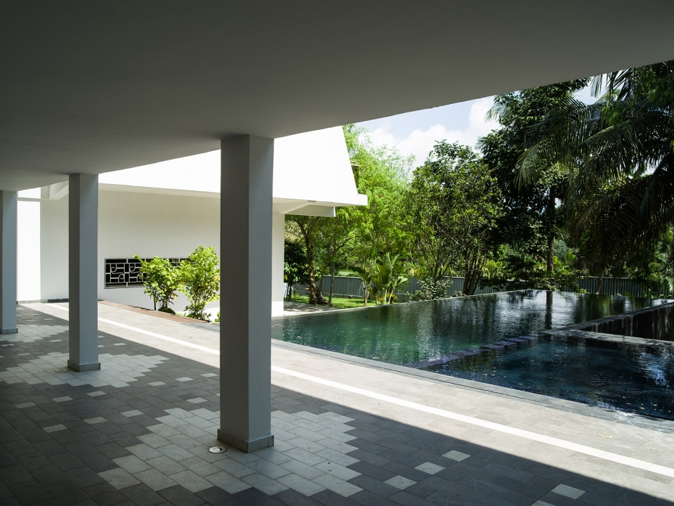 站在走廊上看泳池,室外狹長的泳池,棕櫚樹蔭提供了遮陽空間。花園也充滿了自然的意趣,給人一種放松之感,建筑師還在花園的地面上鋪設(shè)了新的灰白兩色圖案的地板,不僅在室外空間中創(chuàng)造了一種視覺聯(lián)系,更是將室外空間統(tǒng)一了起來。