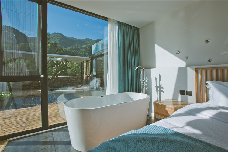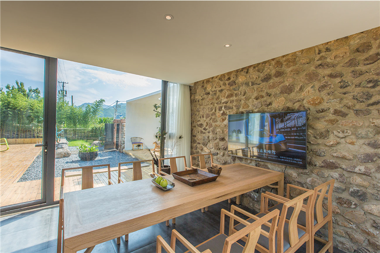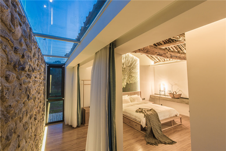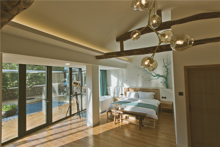 “隨著越來越快的生活節(jié)奏我們每天奔忙,每天遺忘城市越來越近,鄉(xiāng)村卻越來越遠(yuǎn)”。這所名為“畫框里”的民宿位于水泉子村,而名字寓意為將百里畫廊的山水美景留在畫中院中。可看到名副其實(shí)靈動的山水畫這四季的變幻,凝集了我們對生活所有的向往。落地窗邊放置了浴缸做一個(gè)泡泡浴一眼望去是院落的美景和遠(yuǎn)山的意境。主臥空間很寬敞,新中式的原木配灰色的簡易家具些許的現(xiàn)代元素金屬攝影燈使房間內(nèi)多一份輕松感。