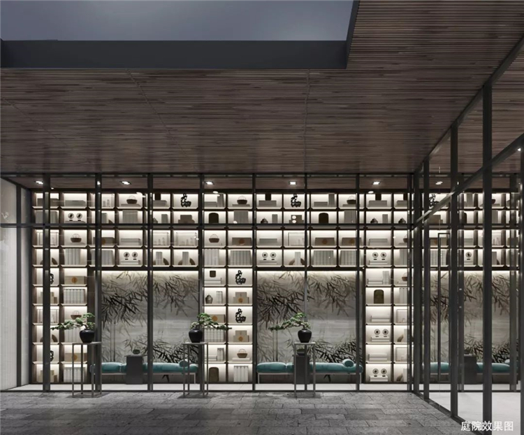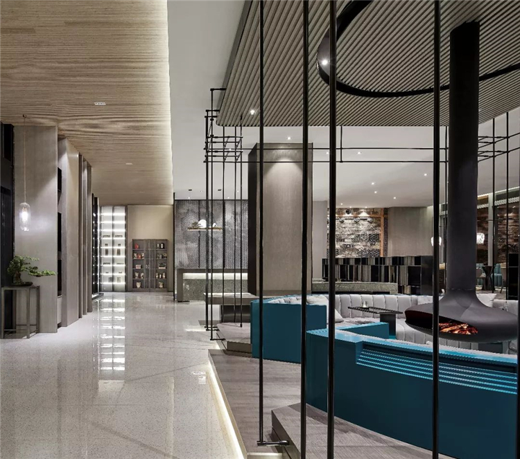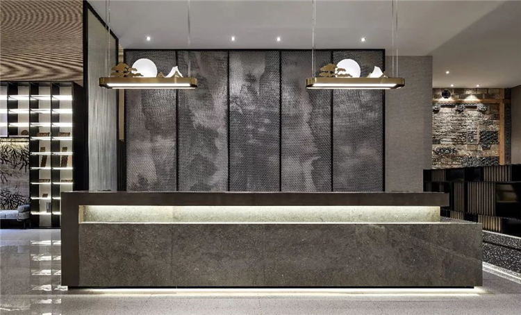 傳統(tǒng)與現(xiàn)代的融合變通,通過(guò)汲取傳統(tǒng)徽派的木構(gòu)斗拱、瓦片、留白的山墻和民居的水墨意境,運(yùn)用新的材料進(jìn)行演繹,如水磨石的地面、背景墻藝術(shù)圖案結(jié)合金屬網(wǎng)、半透的夾絲玻璃、黑色的金屬構(gòu)建.以寫意的方式提取徽州的意境,延續(xù)徽派建筑的黑白兩色,再點(diǎn)以中國(guó)傳統(tǒng)色系軟裝搭配,表達(dá)了設(shè)計(jì)對(duì)傳統(tǒng)的回歸和未來(lái)的展望.
