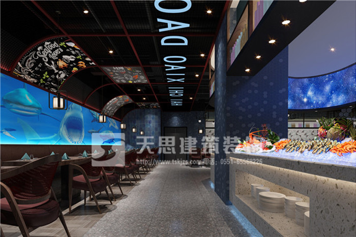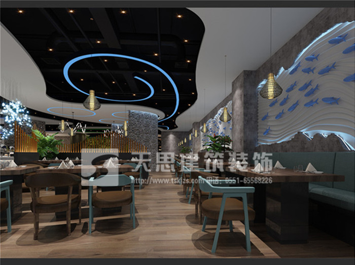 設(shè)計(jì)中的許多元素都是取材于海洋文化,不但讓餐廳充滿了神秘的歷史厚重,還讓豐富多彩的海洋生物成為裝點(diǎn)餐廳的水族館,四處都可以看見各種海洋精靈悠游的風(fēng)景。