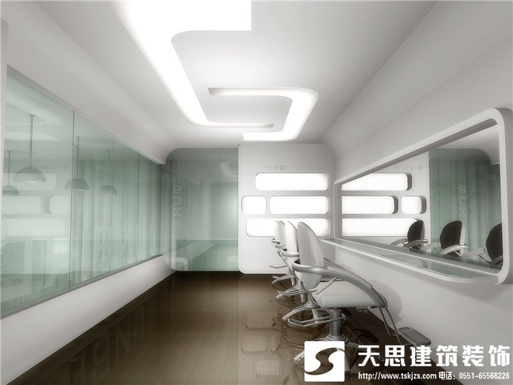 美發(fā)店的操控區(qū)占整個店面面積的四分之三到三分之二不等,操作區(qū)是直接服務顧客的地方,設計師秉承以寬松、干凈、舒適為宗旨,考慮到了顧客方便、暢通。美發(fā)店整體設計要求鏡子要明亮,椅子、床鋪要精美,外形要獨特,色調(diào)要統(tǒng)一。