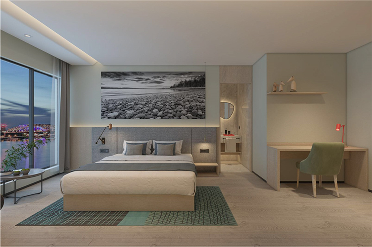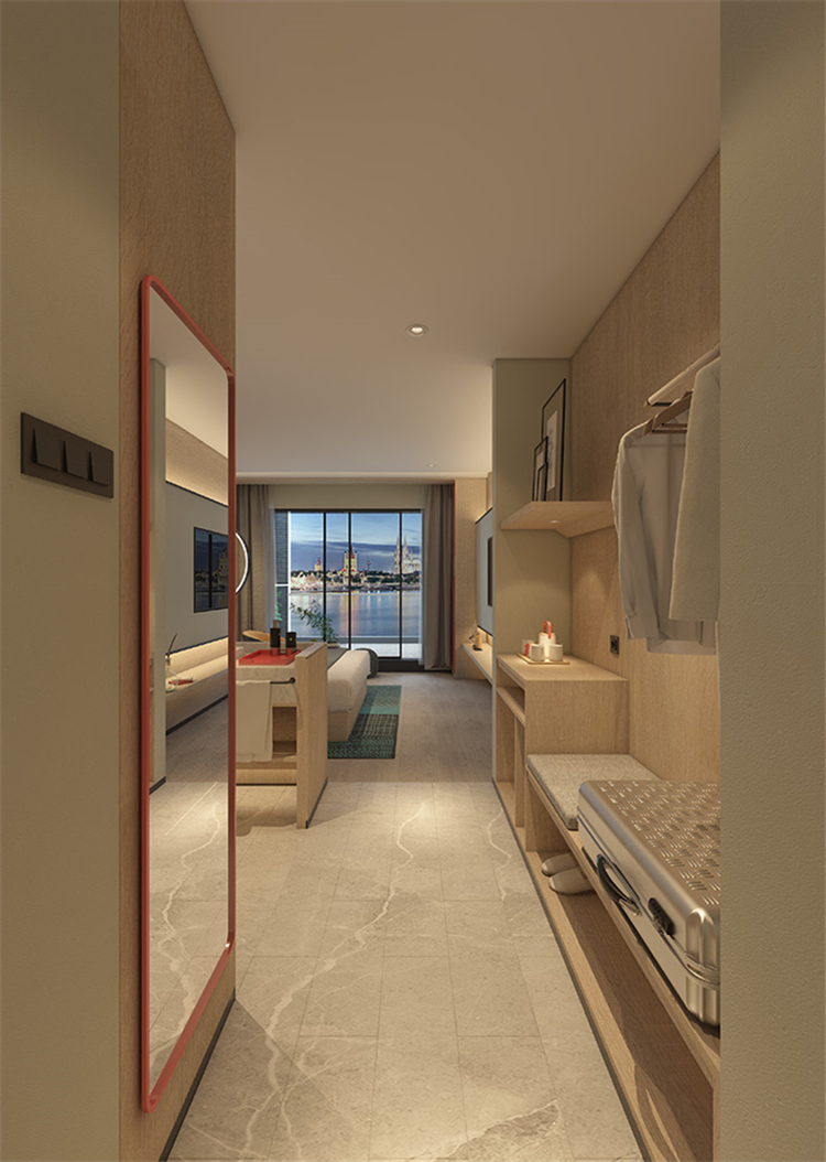 在功能的安排上人性化,為顧客帶來舒適的入住體驗與外立面相呼應(yīng),設(shè)計師在完整的用材體系上,增加了對比性明顯的色塊,高度提升了空間的趣味性和耐看度。