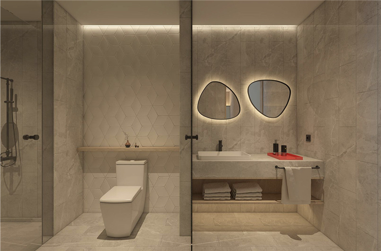 設(shè)計師遵循原有的管道設(shè)計,通過半堵實用的功能墻,將洗浴間和馬桶間劃分,在隱形了五金件和儲物歸納后,化繁為簡被得到了充分的運(yùn)用,就連回風(fēng)口也被巧妙的融入在燈帶里.