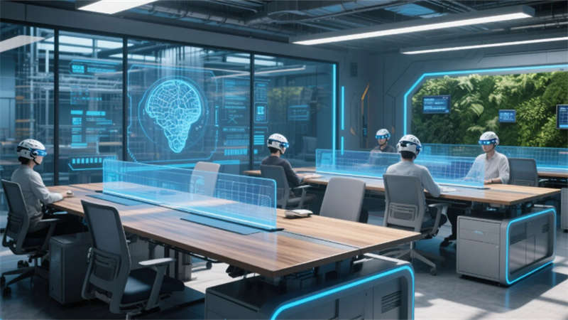 生態(tài)基因貫穿每個(gè)細(xì)節(jié):光伏連廊的遮陽發(fā)電結(jié)構(gòu)隨日照角度變幻肌理,雨水回收裝置化作中庭的液態(tài)雕塑,木紋鋁材桌面流淌著實(shí)時(shí)產(chǎn)能數(shù)據(jù)。智慧會(huì)議室的聲學(xué)穹頂折射出數(shù)據(jù)暴雨,玻璃幕墻在沙漠與極地場(chǎng)景間瞬時(shí)切換,腕表投影界面與全息沙盤構(gòu)成決策中樞。
