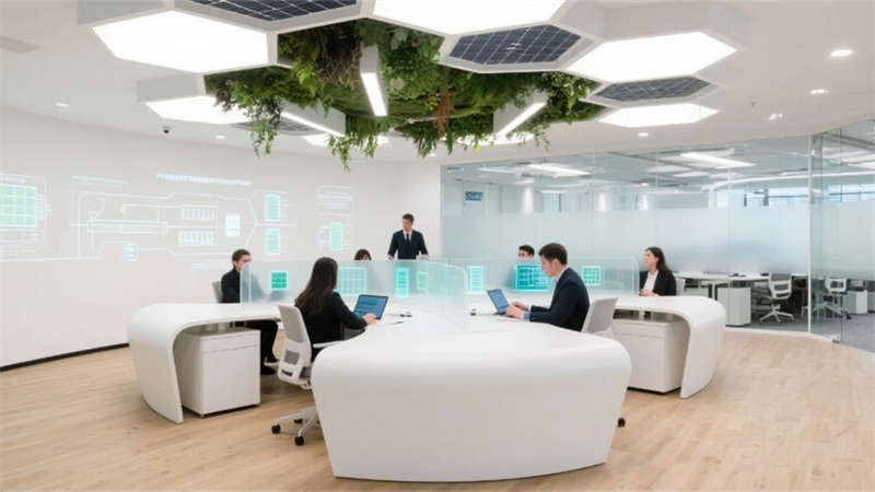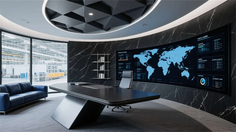開放式辦公區(qū)打破傳統(tǒng)壁壘,蜂窩狀工位與懸浮綠植裝置詮釋靈動(dòng)協(xié)作,透明屏幕上的數(shù)據(jù)流與玻璃隔斷投影的生產(chǎn)流程圖虛實(shí)相映??偛每臻g則如懸浮的智慧中樞,弧形落地窗將車間全景化作動(dòng)態(tài)壁畫,金屬與大理石的碰撞間,流淌著決策與創(chuàng)新的電流。智能倉儲(chǔ)區(qū)立體貨架的金屬骨骼間,無人機(jī)如蜂鳥般掠過貨品,天光與電子標(biāo)簽的光斑在環(huán)氧地面上跳動(dòng)著數(shù)字時(shí)代的韻律。