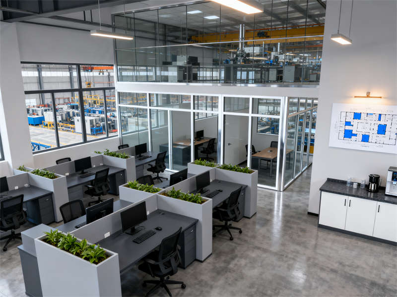成品檢驗(yàn)區(qū)配備精密檢測儀器,合理的分區(qū)設(shè)計(jì)與適宜的照明,為精準(zhǔn)檢測提供保障。員工辦公區(qū)與休息區(qū)則兼顧實(shí)用性與舒適度,開放式辦公布局搭配獨(dú)立辦公室,休息區(qū)的沙發(fā)、餐柜等設(shè)施,為員工營造出良好的工作與放松環(huán)境。整體設(shè)計(jì)在色彩與材質(zhì)運(yùn)用上保持高度統(tǒng)一,既體現(xiàn)工業(yè)廠房的專業(yè)特質(zhì),又增添了人性化氛圍。?