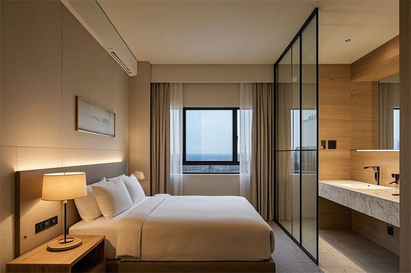 客房設(shè)計(jì)延續(xù)了現(xiàn)代簡約的風(fēng)格,淺木色與灰色的主色調(diào)搭配,營造出寧靜而舒適的居住環(huán)境。寬敞的落地窗將城市美景盡收眼底,智能燈光系統(tǒng)與電動窗簾為您提供便捷的入住體驗(yàn)。干濕分離的衛(wèi)生間采用大理石臺面與玻璃隔斷,既實(shí)用又彰顯品質(zhì),讓您在繁忙的旅途中也能享受片刻的放松。