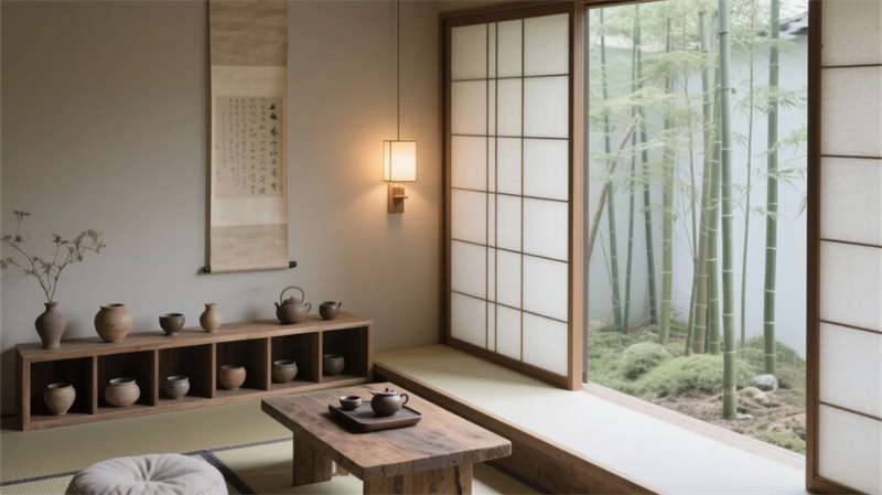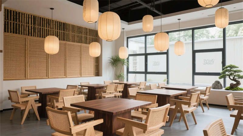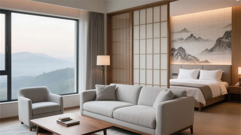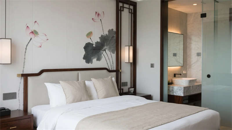 大堂以格柵天花與山水背景墻定調(diào),光影交錯(cuò)間傳遞寧?kù)o力量。餐廳借竹編與紙燈演繹傳統(tǒng)匠心,窗外庭院景觀延伸視覺層次??头哭饤壏睆?fù)裝飾,棉麻材質(zhì)與低飽和度色彩引導(dǎo)深度放松,套房通過屏風(fēng)巧妙劃分動(dòng)靜區(qū)域。茶室以博古架和宣紙屏風(fēng)構(gòu)筑禪修意境,而庭院花園的枯山水與竹影,則成為自然與建筑的共生隱喻。