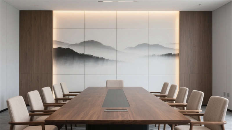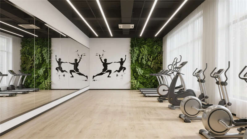 健身區(qū)與會(huì)議室平衡功能與美學(xué),金屬器械融入水墨肌理,會(huì)議長(zhǎng)桌呼應(yīng)胡桃木的溫潤(rùn)質(zhì)感。整體設(shè)計(jì)弱化邊界,讓光、影、材質(zhì)在流動(dòng)中對(duì)話,為合肥注入一處隱于城市的東方精神綠洲。