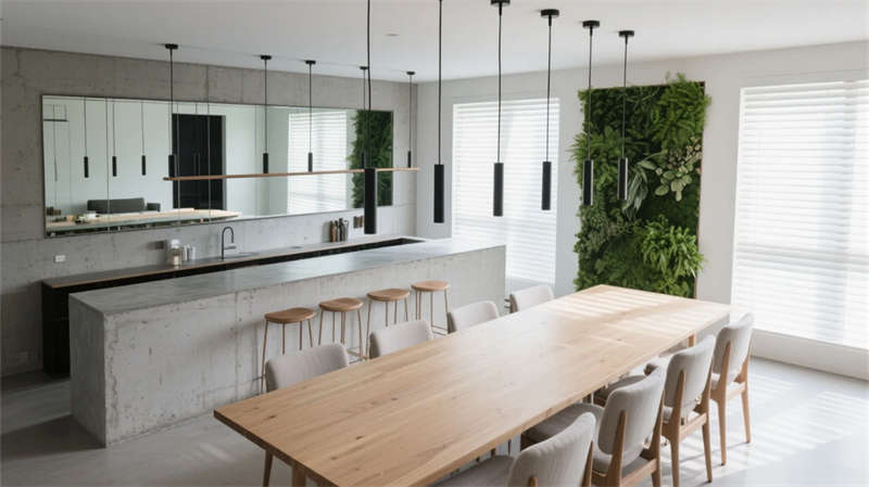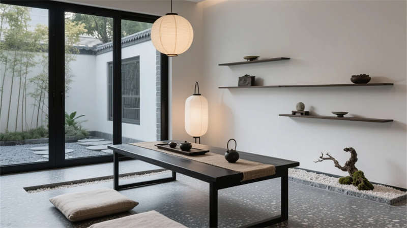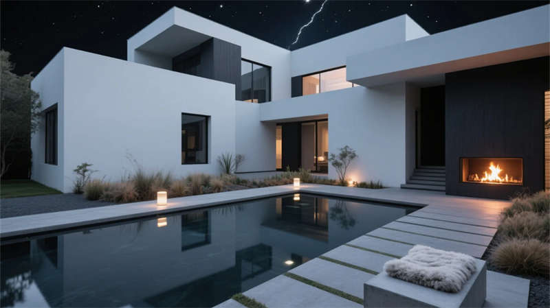 庭院成為生態(tài)樞紐,幾何水景倒映建筑體塊,耐旱植物與灰石板構(gòu)成低維護(hù)景觀。多功能廳通過靈活隔斷適應(yīng)共享需求,藝術(shù)品陳列架隨動線旋轉(zhuǎn)生趣。整體摒棄繁復(fù)裝飾,用材質(zhì)本真觸感、光影時間軌跡與城市山水意境,營造大隱于市的當(dāng)代棲居范本。