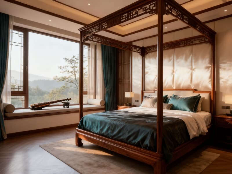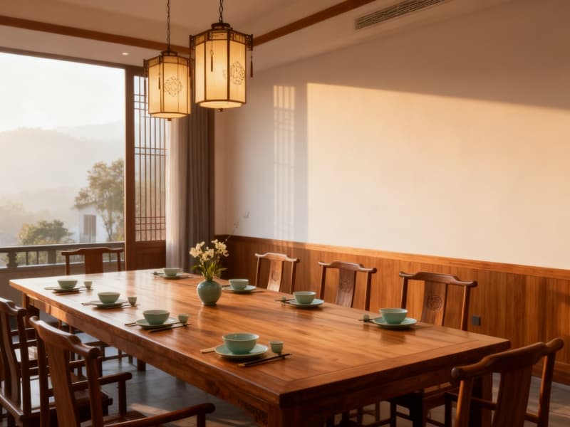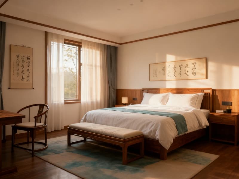 室內(nèi)空間借由廣角鏡頭可感知的通透布局,讓原木紋理成為空間的重要語言。公共區(qū)域的桌椅、隔斷均選用帶有自然木紋的實木材質(zhì),搭配淺色系軟裝,清晨的光線透過窗欞灑入,在木紋上形成柔和的光影,增添空間的層次感??头吭O(shè)計注重細(xì)節(jié),床頭背景墻以簡約的中式紋樣點綴,床品選用素雅色調(diào),與原木家具呼應(yīng),營造出安穩(wěn)休憩的氛圍。?