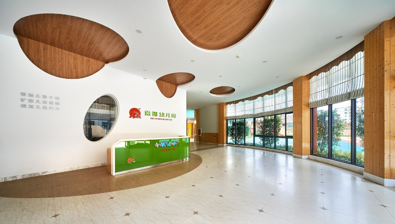 這是一個圓環(huán)形建筑,所有的空間圍繞橢圓中庭展開.陽光是這個空間的主宰,它撒落的光影在地上、在墻上、在左、在右……變幻著它不同的風景.配合著自然光斑,設計師以圓點為裝飾元素,在白墻木色的背景下綠色、黃色、橙色、藍色的圓點跳躍于墻面、吊頂,以及現(xiàn)代構成感的大色塊裝飾,營造出清新自然、簡潔溫馨的幼兒園環(huán)境.而在這個空間里,"大象、蝸牛、蝴蝶"是激活空間的另一趣味元素,它們或是停在門口、或是躲在墻角、或是戲弄在圓點中、或是趴在地上…….和孩子們互動著.
