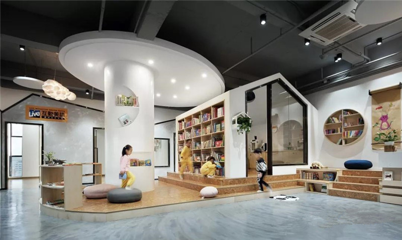 為了保持空間的調(diào)配度,不做過多裝飾;色彩把控上,選擇自然親和的白、灰、木色調(diào),孩子們是唯一的濃墨重彩,繪本則是星星點(diǎn)點(diǎn)的輔助色。用“書吧”的概念打造大廳,弧形書架、圓形吊頂與地面抬升的設(shè)計(jì),讓繪本閱讀成為體量內(nèi)的重心。