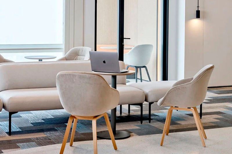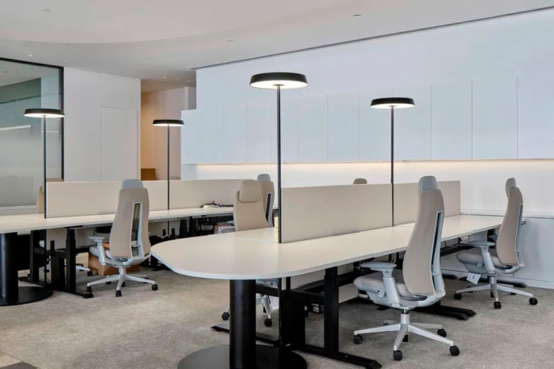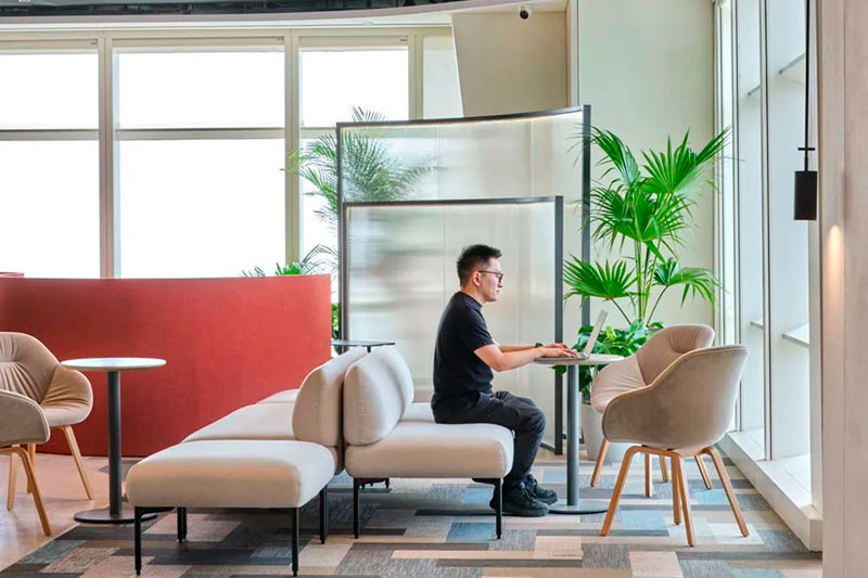 后場(chǎng)辦公區(qū)延續(xù)了前廳的辦公理念,結(jié)合不同功能形式的會(huì)議室、電話間,提供了多選擇的工作模式,簡(jiǎn)潔而高效。大量可再生面料的墻飾、可回收吸音板和仿生苔蘚的應(yīng)用,豐滿了視覺(jué)層次并極大提升了空間的聲學(xué)效果。