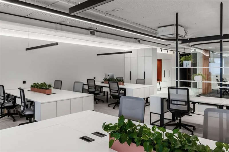 淺灰色的頂面與地面,配以白色墻體和主體辦公家具,再輔以縝密的燈光照明,讓室內(nèi)呈現(xiàn)明亮純凈的光彩質(zhì)感;黑色線性元素的加入豐富了空間構(gòu)成和視覺趣味性;唯一的暖棕色彩的點(diǎn)綴讓空間更靈動更富有層次感,也為純凈極簡的空間帶去一抹溫暖氣息。