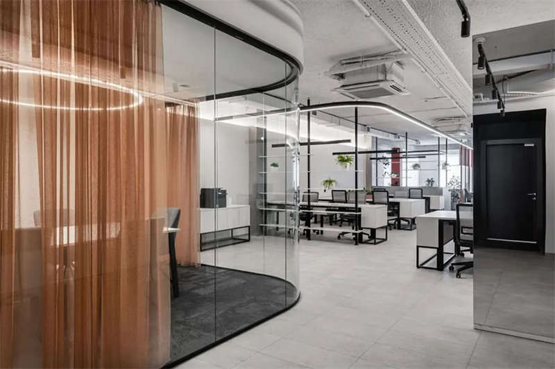 會議室的半圓形形狀類似于智能手機(jī)上的耳機(jī)。由透明的玻璃圍合的會議室即界定了空間,又帶來輕盈靈動的通透感,且玻璃自身無與倫比的光澤感也賦予空間時(shí)尚和未來的氣息。