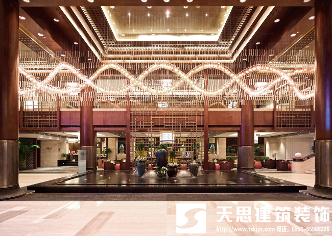 大堂的另一個(gè)風(fēng)格以抽象的格柵為裝飾,在中央景區(qū)的水景以寧?kù)o來(lái)突出水的主題,并以木格柵與水景組合成抽象的構(gòu)成。吊燈以水泡燈作為裝飾,有溫泉?dú)馀莸碾[喻,突出酒店設(shè)計(jì)的主題。