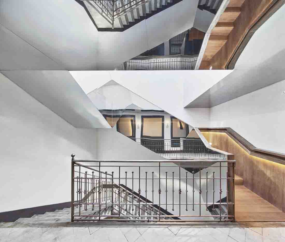 在整個建筑中設(shè)計并開發(fā)了一系列建筑策略,作為與現(xiàn)有建筑對話的戲劇性和當(dāng)代特色的干預(yù)措施的集合。在底樓,一條綠色的植被走廊侵入餐廳,將花園與庭院和街道連接起來。