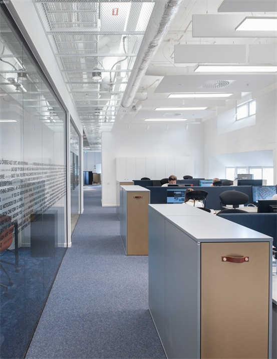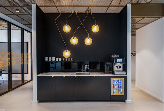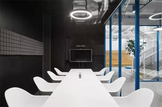 時尚與藝術(shù)并存的辦公室設(shè)計案例:整個空間設(shè)計手法簡約,原有建筑構(gòu)造和設(shè)備管線都展露無遺,色彩的巧妙構(gòu)筑讓這處極簡loft風(fēng)的辦公環(huán)境充滿了時尚的活力氛圍。墻面上充滿活力的圖案和一張乒乓球桌是視覺中的主角,而主入口就在這里。這里沒有傳統(tǒng)的接待臺,訪客進(jìn)入辦公室,可以為自己沖杯咖啡,然后進(jìn)入到內(nèi)部空間。入口處設(shè)有員工更衣室。辦公室的中央是一處大型演講廳,也是主要的活動場所。多功能演講廳配有看臺式階梯座、咖啡吧、屏幕和投影儀、講臺和所有其它必要的設(shè)備,即可以舉辦研討會、各種宣講,也是一處極為舒適的聚會場所??臻g內(nèi)的照明設(shè)計非常獨(dú)特,采用了網(wǎng)格狀的矩陣布局,將所有燈具串聯(lián)在一起,形成精致的美學(xué)效果。整個空間形成一個明亮的背景,襯托出有趣的設(shè)計細(xì)節(jié)和墻面圖形設(shè)計。