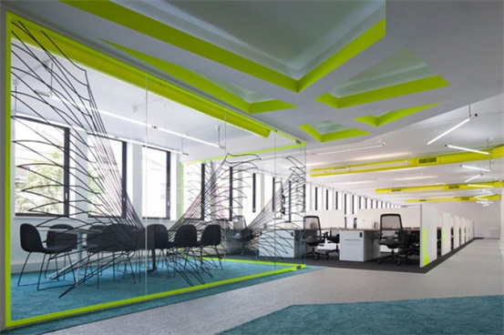 時尚辦公室裝修設(shè)計:以白色為空間主調(diào),加入充滿活力的顏色,如霓虹黃色頂面線槽、以及柔軟的綠松石色地毯點(diǎn)綴在灰與黑色地毯間。裸露的頂面管道噴涂以同樣的黃色;每一組工位都以醒目的霓虹黃色字母加以標(biāo)識??臻g的其它色彩以中性色加以調(diào)和,以免跳躍的霓虹黃色太過強(qiáng)烈刺激。會議室的玻璃隔墻,上面繪制了一系列的天使(Angel)翅膀圖形,為密集的辦公區(qū)增添了豐富的視覺效果。休閑區(qū)與辦公區(qū)之間一道纏繞于金屬管道之間的紅色Z字型隔屏,活躍了空間色彩。設(shè)計師以清新簡約的空間配色,打造了一個開敞明亮、且獨(dú)具個性特色的時尚辦公室。