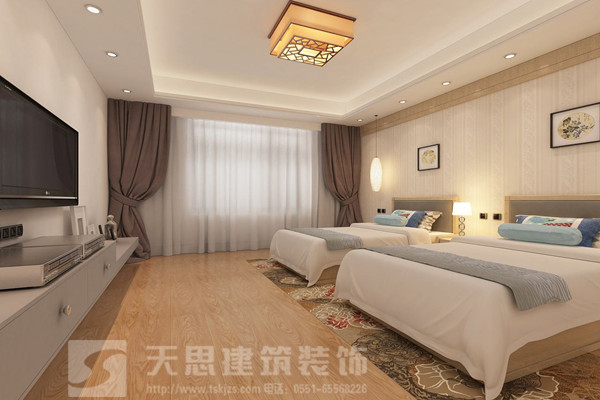 小型酒店客房,多以標(biāo)準(zhǔn)間、單人間為主,面積一般不會太大,不過可以利用延伸視覺效果的方法,來提升客房空間感。比如運(yùn)用由淺到深、富有層次感的彩色壁紙,搭配淡雅干凈的鋪蓋,安裝采光自然、光照充足的落地窗,延伸空間的同時(shí)也提高了舒適度。