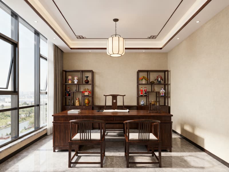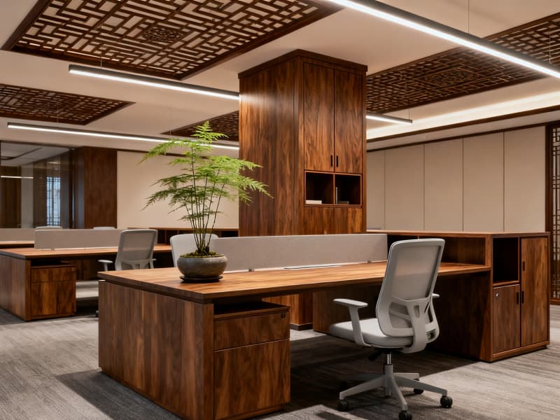 空間布局上,科學(xué)劃分開放辦公區(qū)、獨(dú)立辦公室、會議室、休閑區(qū)等功能區(qū)域,優(yōu)化動(dòng)線設(shè)計(jì),保證辦公效率與使用舒適度。色彩以淺色系為基底,搭配深棕色實(shí)木元素,營造雅致、沉穩(wěn)的視覺效果,同時(shí)通過落地玻璃窗、中式格柵吊燈等設(shè)計(jì)引入充足自然光線,減少空間壓抑感。