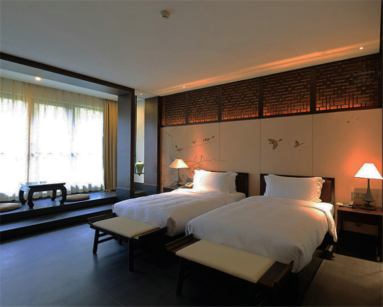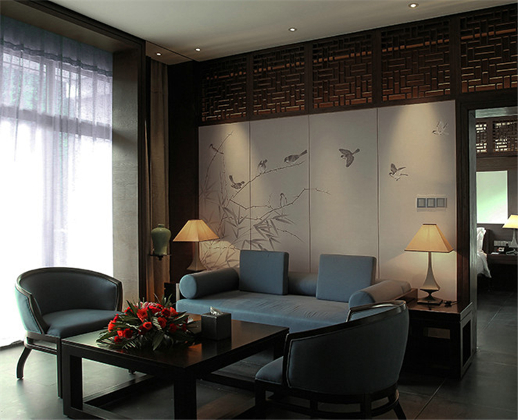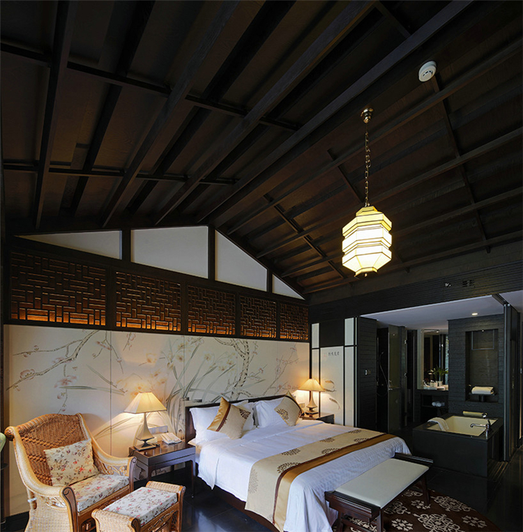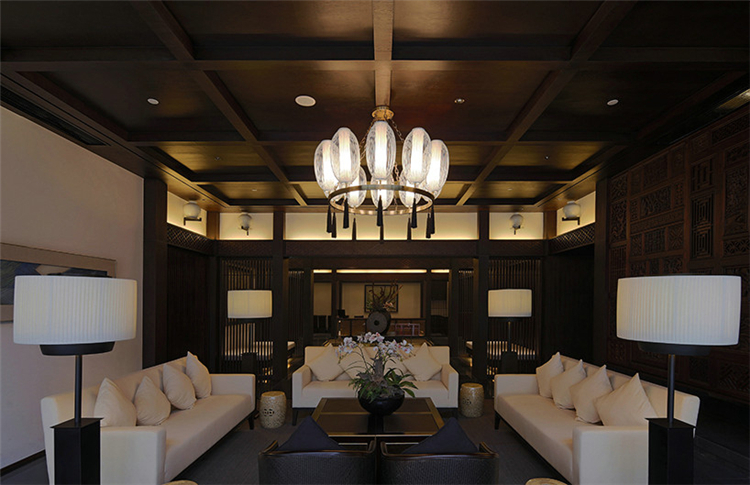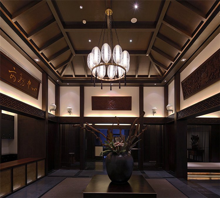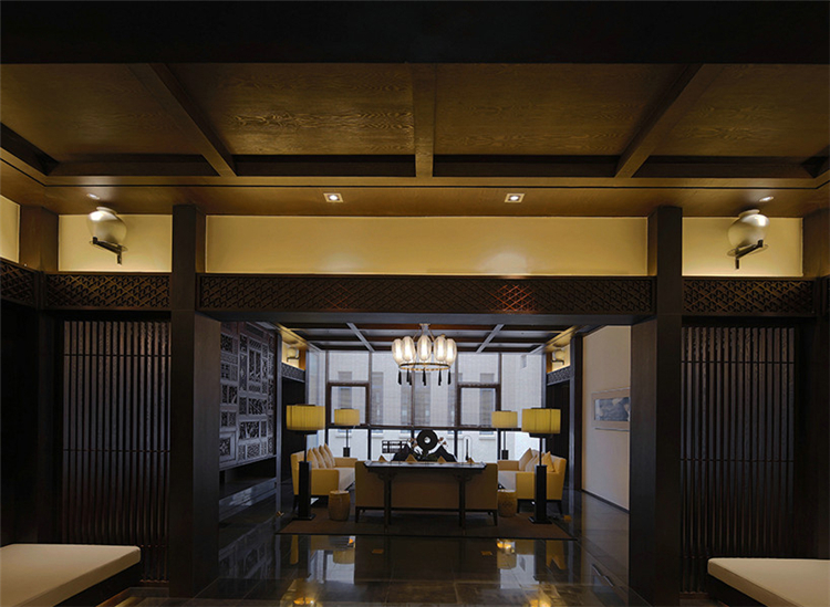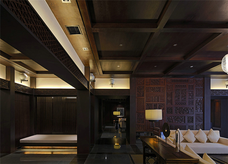 走入大堂,室內(nèi)空間寬闊,天花鱗次櫛比通向樓梯方向,墻面灰色石材雕刻,將桃花源記中的詩(shī)句映入客人眼簾,禪境古意撲面而來。鏤空屏風(fēng)隔墻的設(shè)計(jì),讓空間隔而不斷,與具有傳統(tǒng)韻味的家具和配飾相互交融,打斷俗世的紛擾。柱子和天花上的裝飾燈具,利用金屬和木材兩種截然不同的材料和質(zhì)地,創(chuàng)造空間內(nèi)在張力,透過銳利的金屬、細(xì)膩的木質(zhì)線條強(qiáng)調(diào)空間結(jié)構(gòu),精致筆挺的吊燈,令空間由內(nèi)向外展現(xiàn)獨(dú)特魅力。