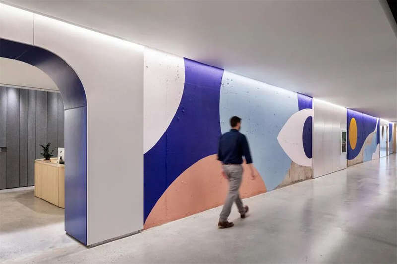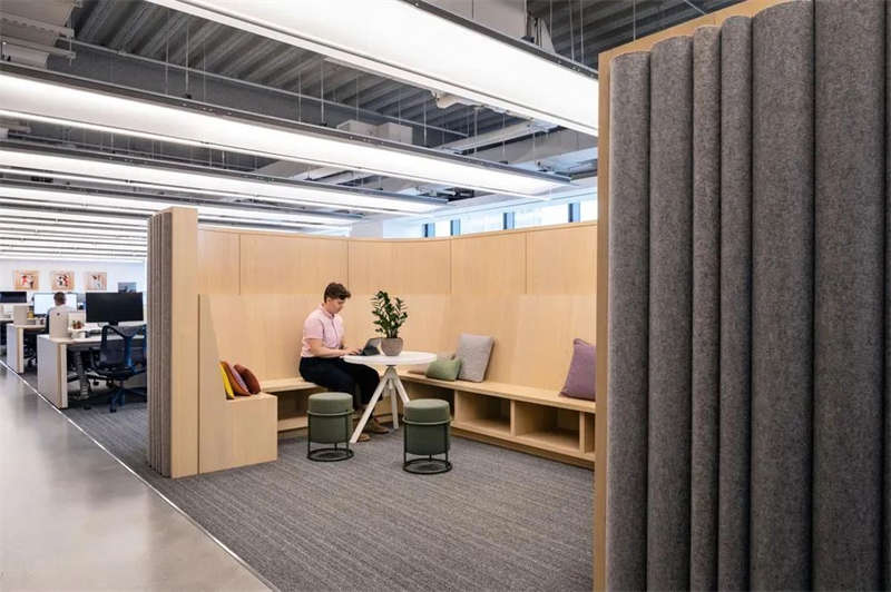 空間的聲學(xué)設(shè)計也經(jīng)過專業(yè)團(tuán)隊的仔細(xì)考量,以確保靈活的協(xié)作空間具有吸引力、舒適性和高效生產(chǎn)力。各種類型的會議空間從大型會議室到全面毛氈飾面的靜音“工作艙”;在辦公桌上方,采用了定制的聲學(xué)毛氈弧形擋板集成照明裝置,由此優(yōu)化開放工作區(qū)的聲學(xué)效果。