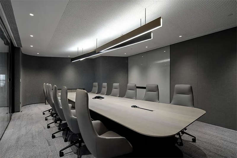 進入會議空間,設計師刻意控制它的視覺張力,前區(qū)的體驗得以延續(xù),灰黑色調(diào)覆蓋目力所及并引入更多的柔性材料,專業(yè)、專注是會議空間的功能立本但也不乏我們對活力元素的照拂,每一個會議室我們都選擇了形式各樣的藍色地毯來裝點。